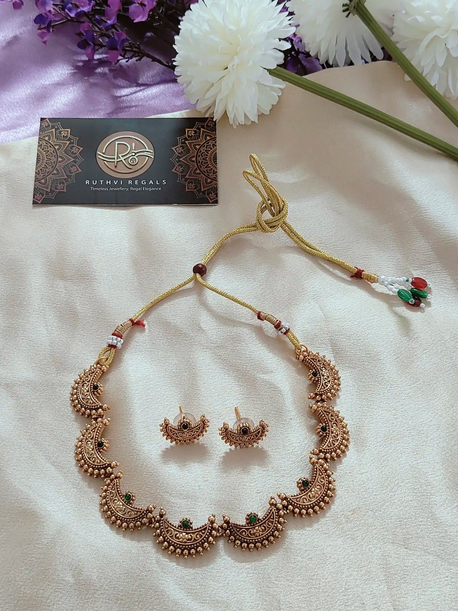 Elevate your ethnic look with this beautifully handcrafted choker set featuring crescent-shaped motifs and ruby-toned stones. Designed with a matte antique finish, this set includes matching earrings and pairs perfectly with traditional sarees and festive attire. Lightweight and comfortable, it’s an ideal choice for weddings, festivals, and special occasions.