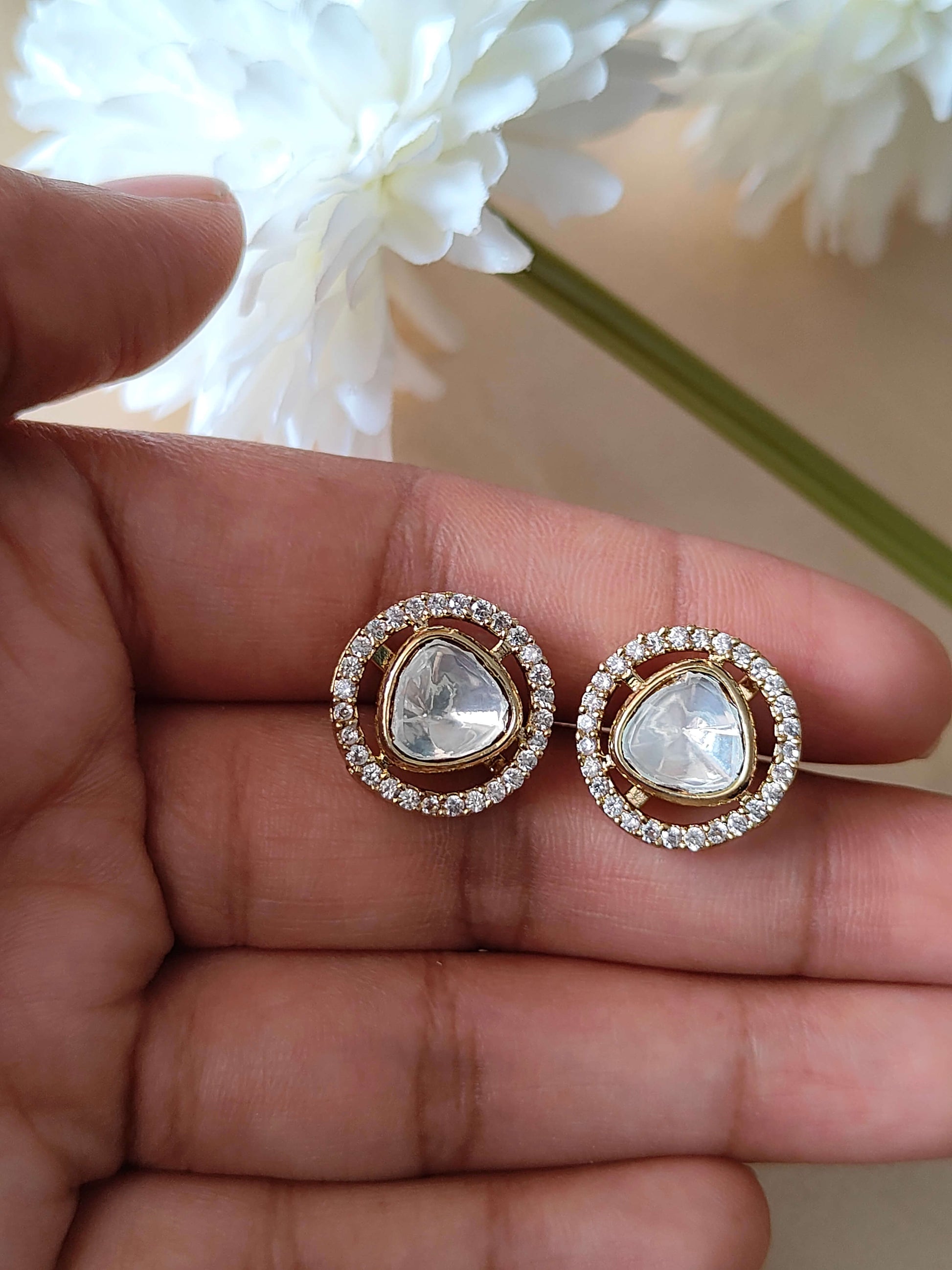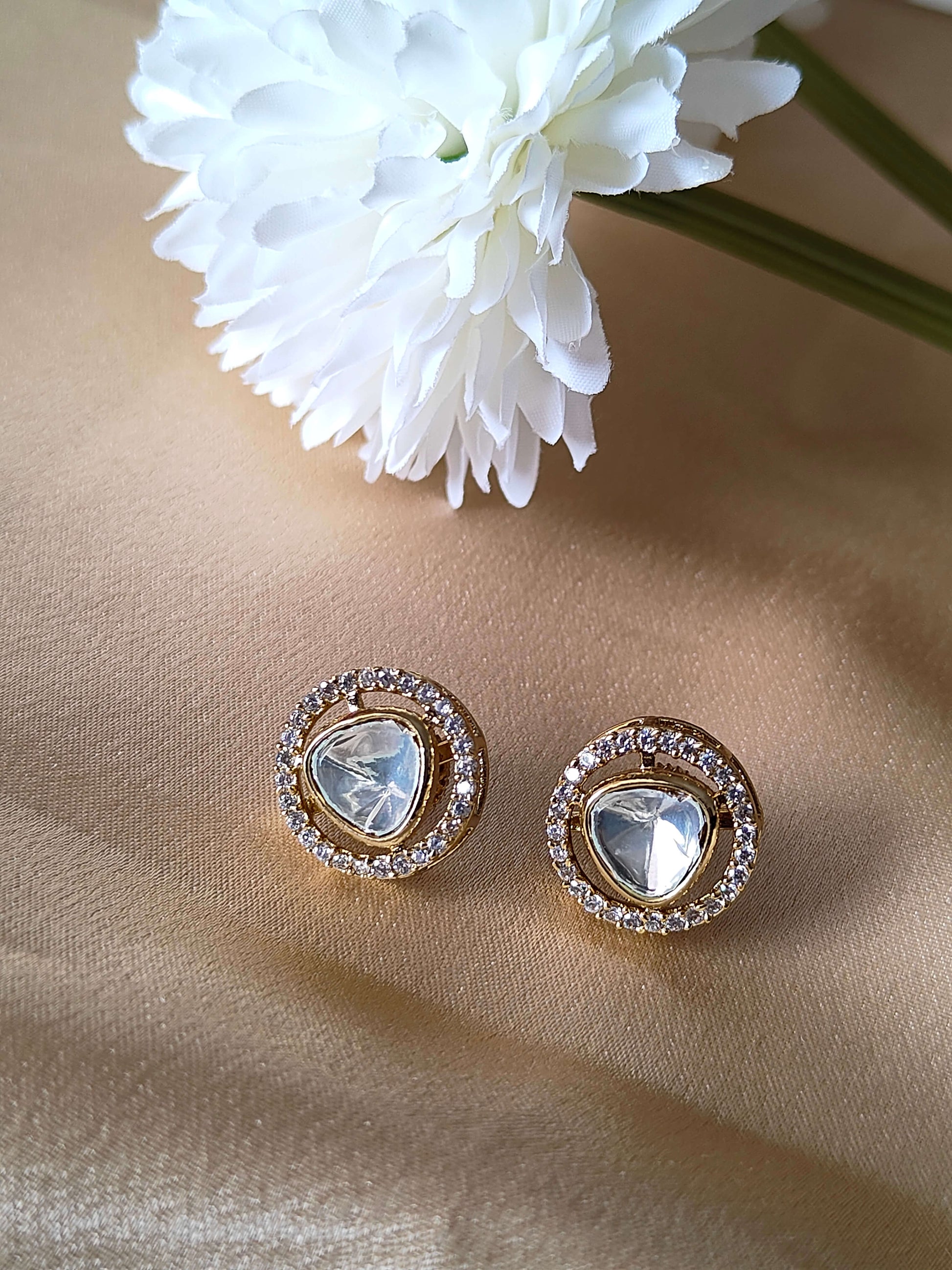 Delicate, dazzling, and effortlessly chic — these circular Kundan stud earrings are your perfect everyday sparkle. Set in a gold-tone frame with a halo of shimmering stones, they bring subtle glam to both traditional and contemporary outfits.