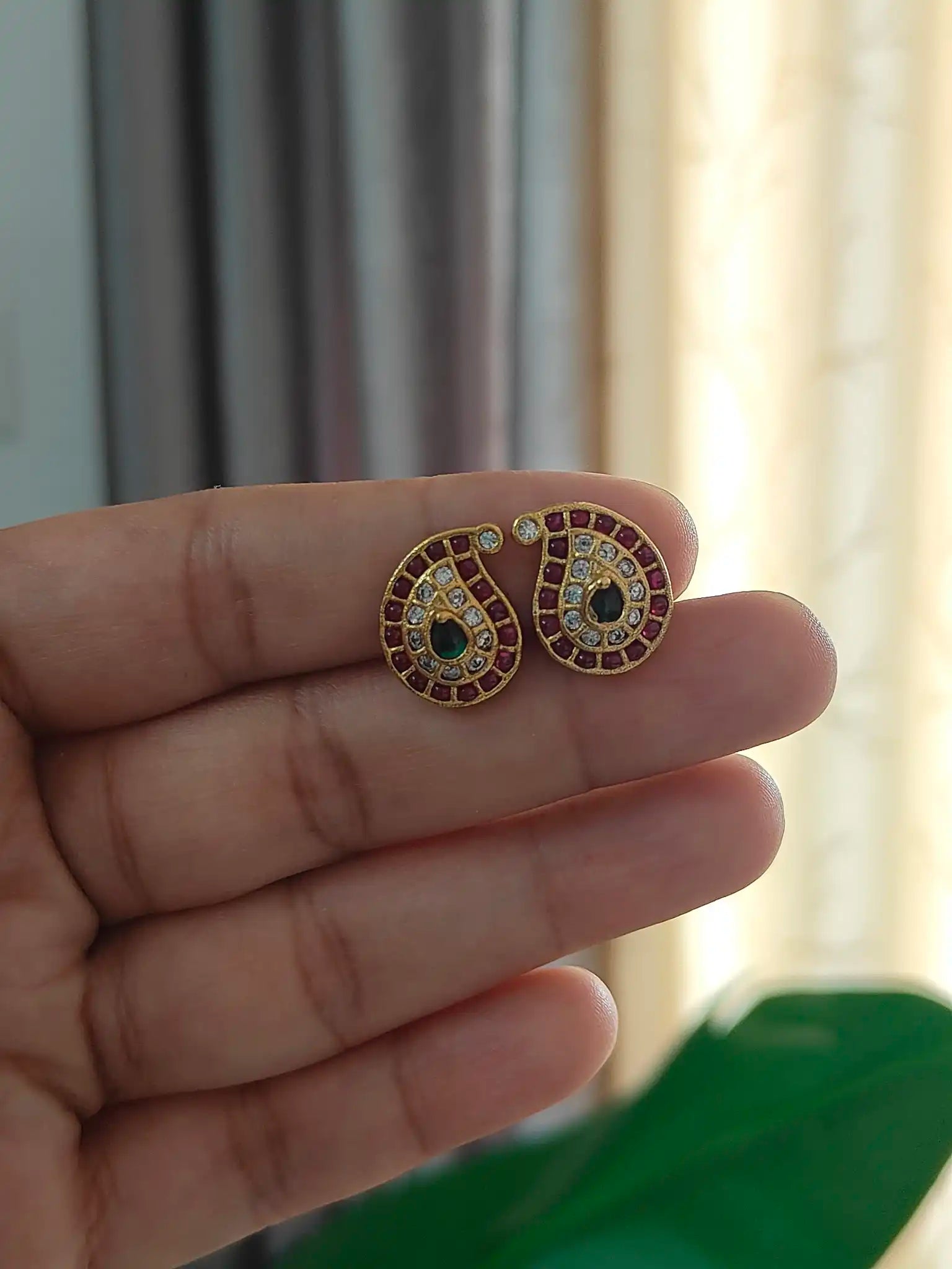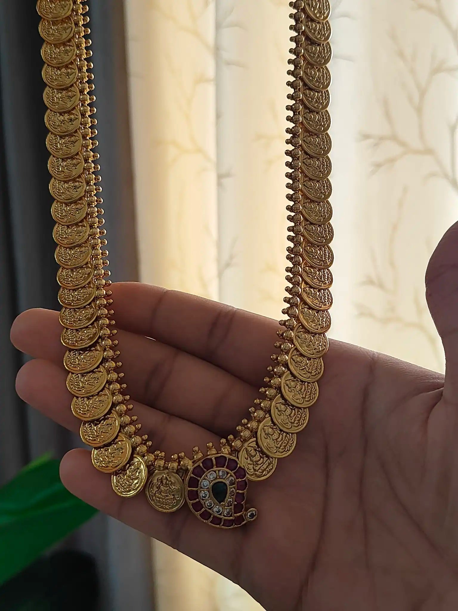This traditional Lakshmi Kasu necklace features intricately crafted goddess coins paired with a ruby-studded Mango design pendant. Its antique gold finish gives a rich, timeless temple-jewellery look perfect for festive and bridal styling.