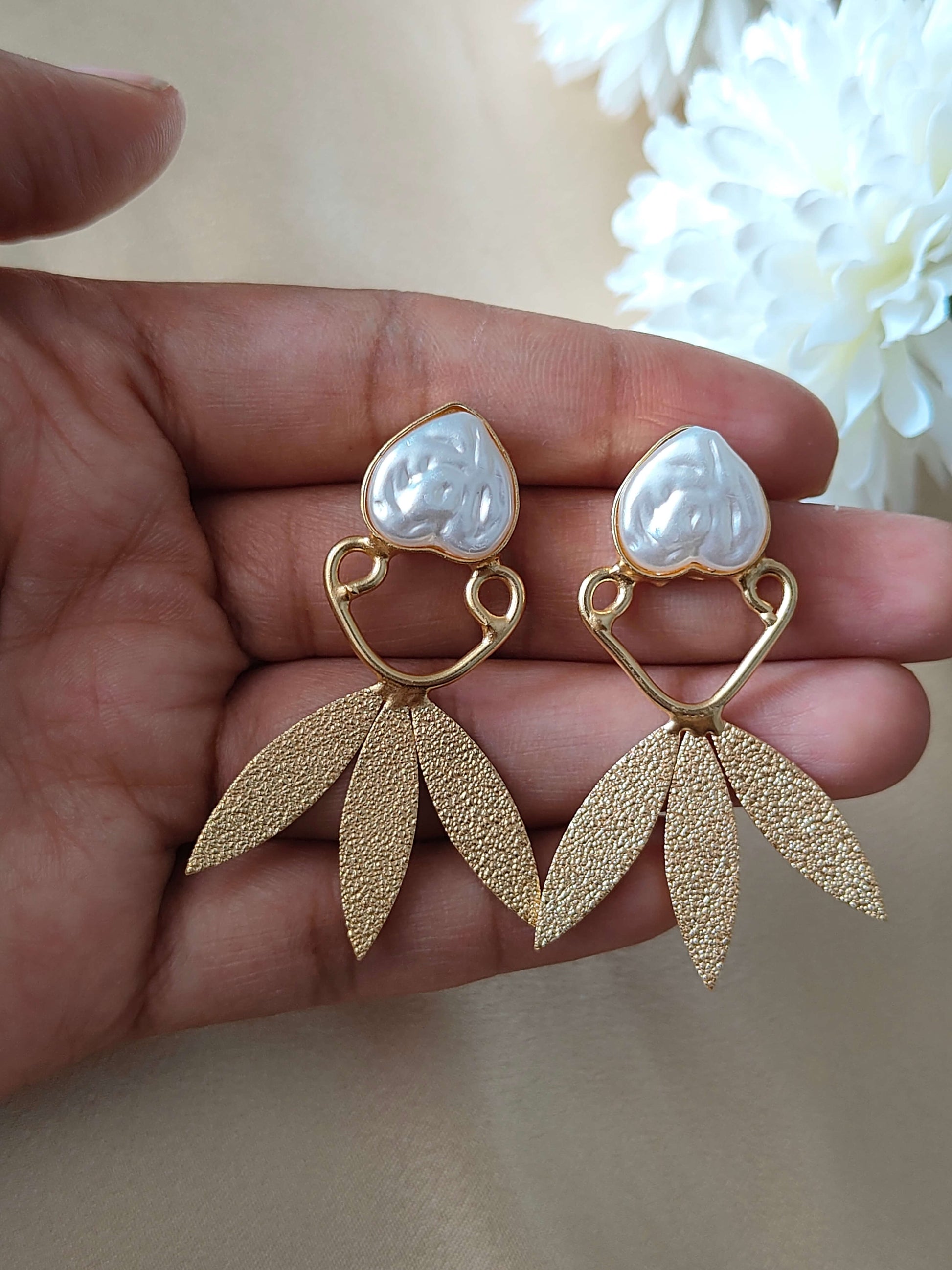 These elegant earrings feature a heart-shaped faux pearl stud set in a gold-toned frame, beautifully complemented by a trio of delicately textured gold leaf drops. The design blends modern elegance with a touch of nature-inspired charm, perfect for elevating any outfit—be it ethnic or contemporary.