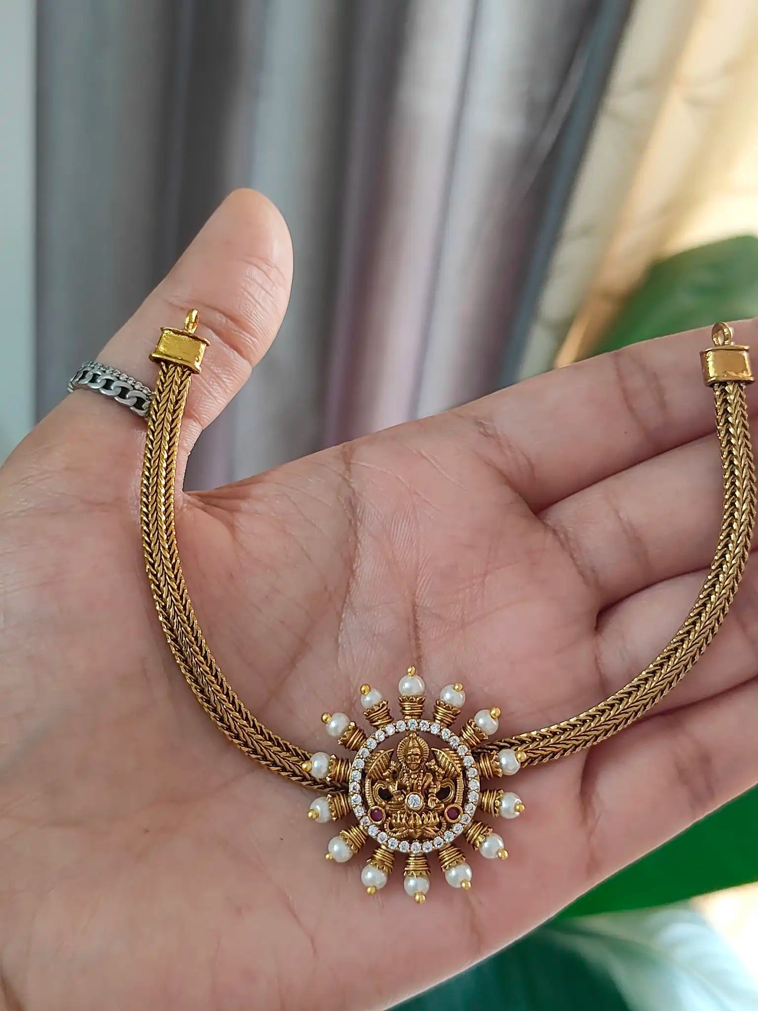 Channel divine elegance with this stunning Lakshmi short necklace set, available in two vibrant variants: