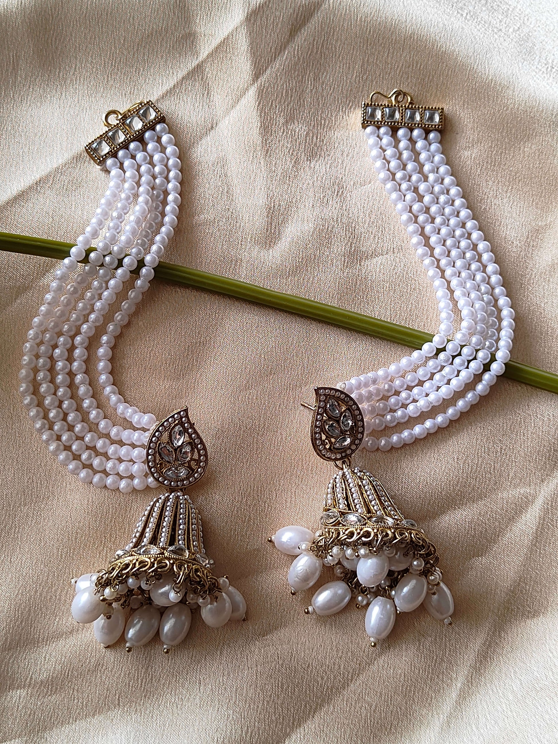 Channel timeless royalty with these exquisite multi-strand pearl passa earrings. Featuring lustrous white pearls, intricately designed jhumka drops, and a sparkling Kundan leaf motif, this piece is perfect for bridal looks, sangeet nights, or a regal statement at festive gatherings. Graceful, grand, and unforgettable — just like you.