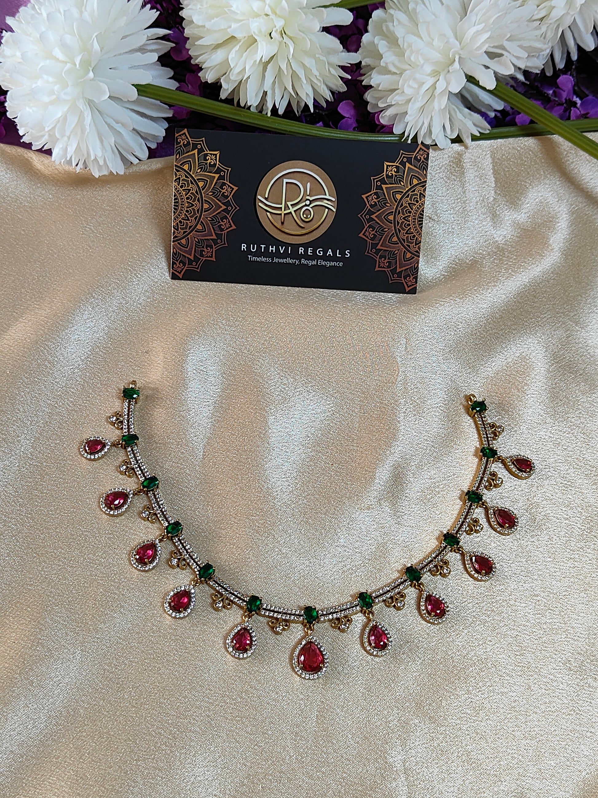 • Elegant necklace with alternating oval emerald-green stones and pear-shaped ruby-red drops.