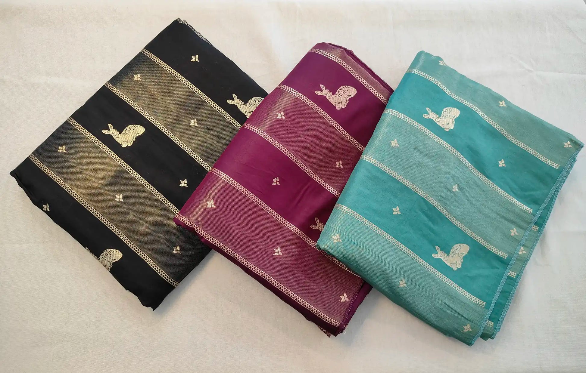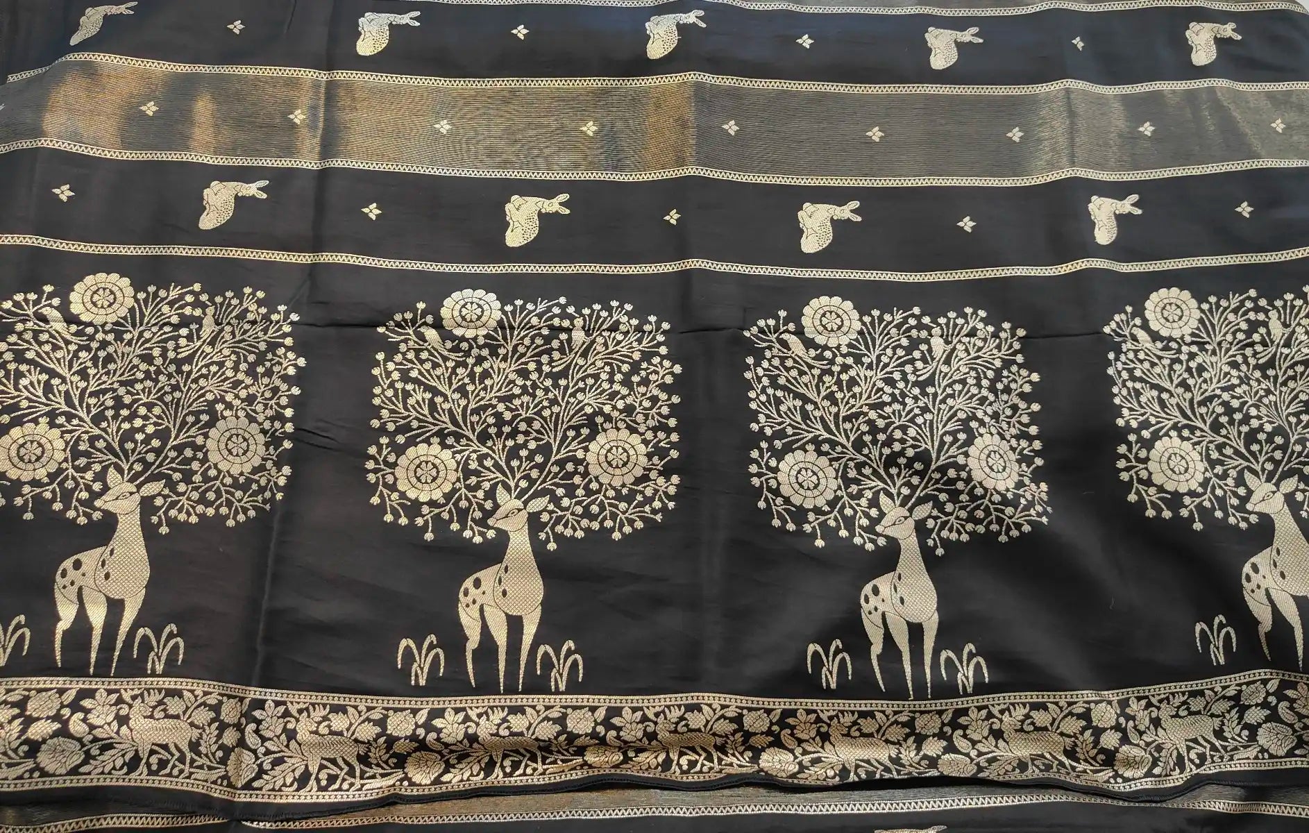 Design: Deer motif pattern with alternating zari-style stripes.