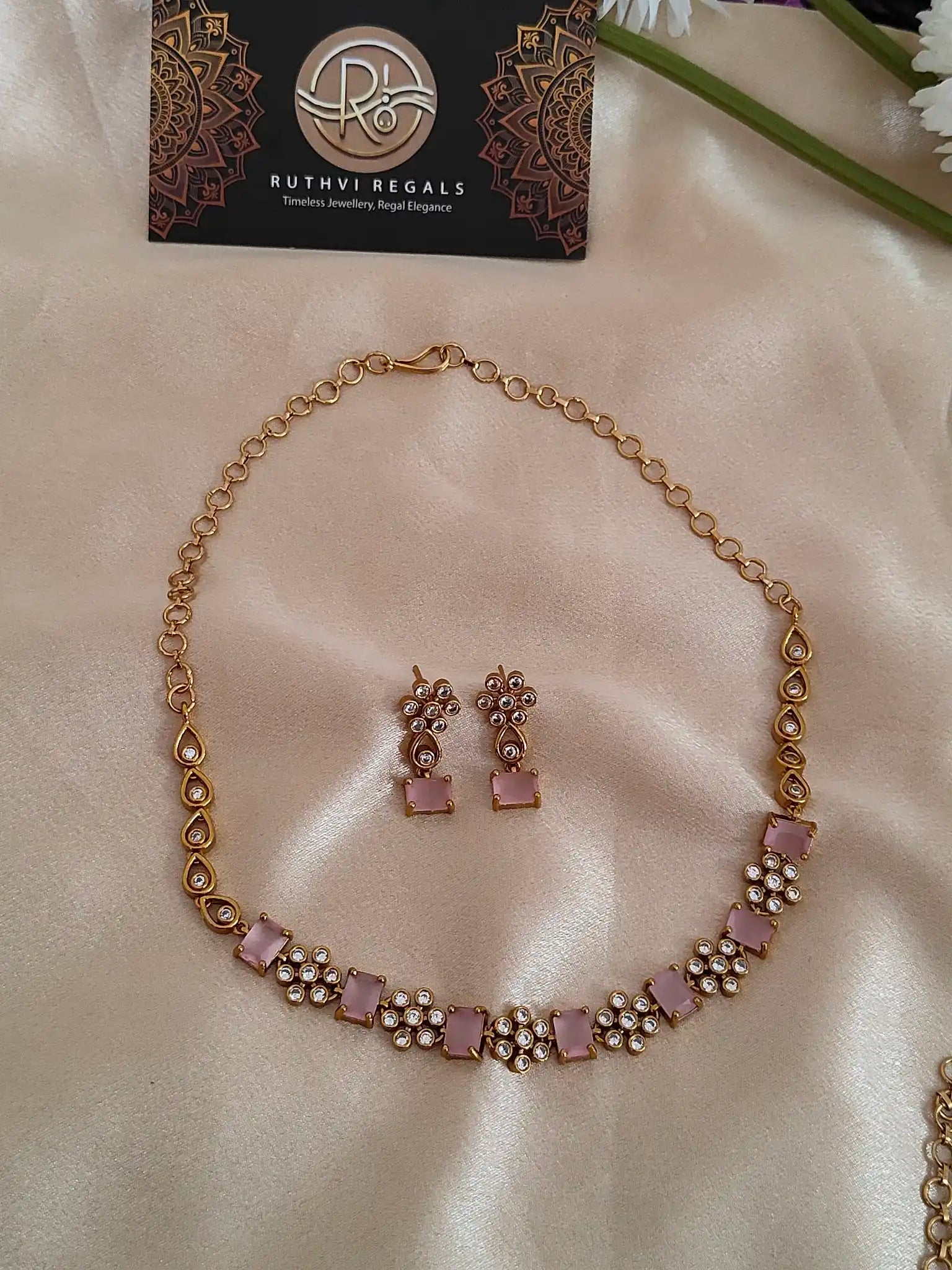 Add a touch of contemporary sparkle to your ethnic or Indo-western look with this elegant short necklace set. Featuring pastel pink, ruby, and emerald center stones surrounded by shimmering cubic zirconia, it’s perfect for light occasions, parties, or gifting