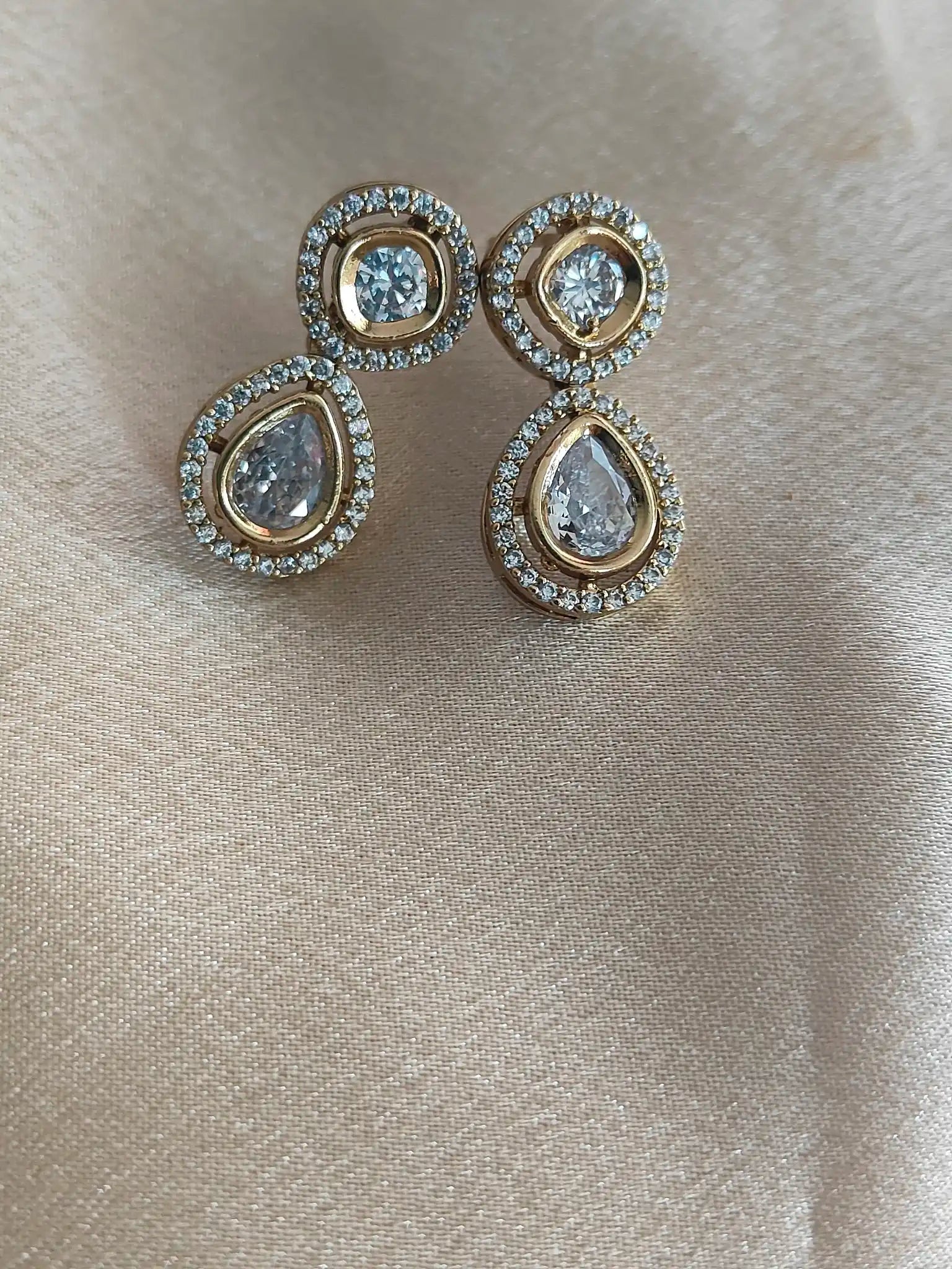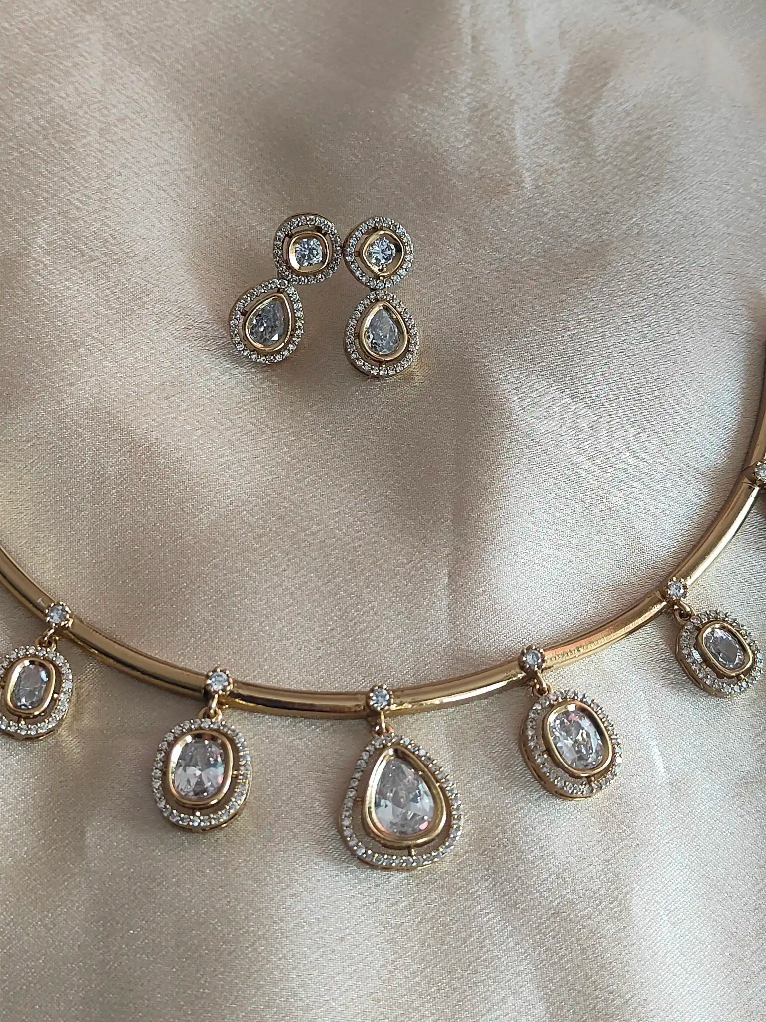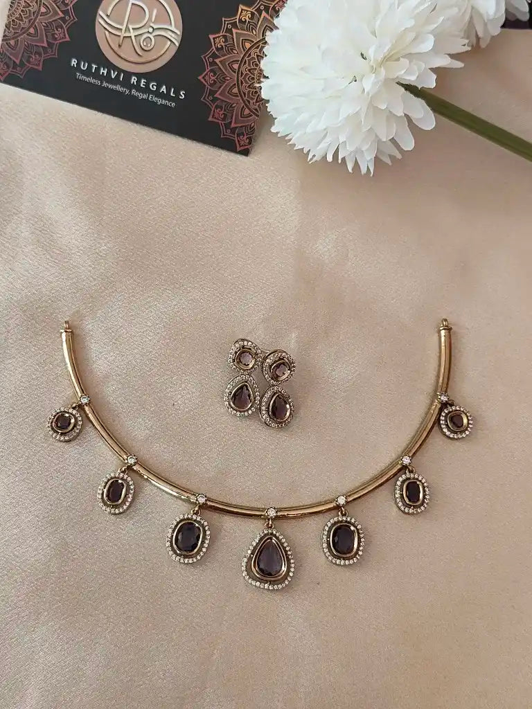 Gracefully crafted, this hasli-style necklace set features teardrop and oval-cut stones encircled by dazzling CZ borders. Available in two captivating tones – Royal Purple for a rich, majestic vibe and Crystal White for timeless grace. Perfect for weddings, festive gatherings, or cocktail evenings. Paired with matching designer studs to complete your look.