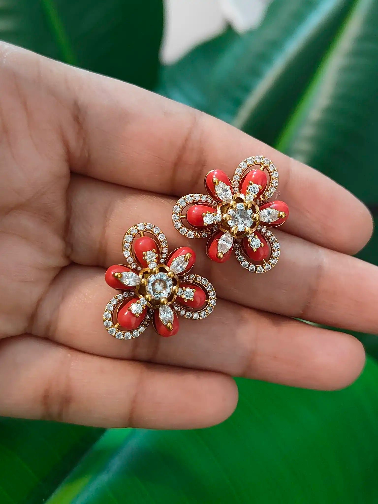 • Floral studs designed with coral-like red enamel and CZ stones.