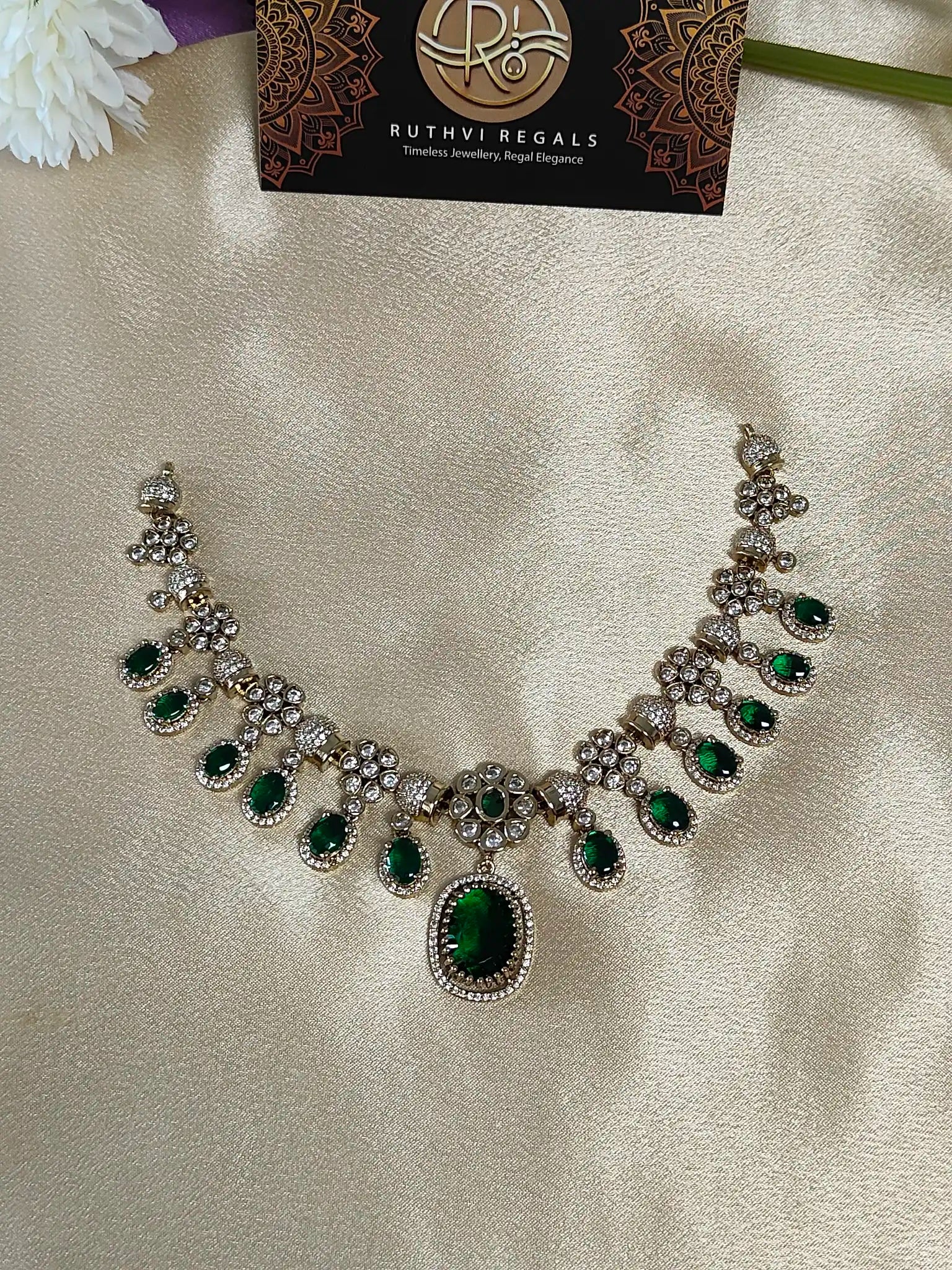 • Embellished with oval-cut emerald green stones surrounded by shimmering American diamonds.